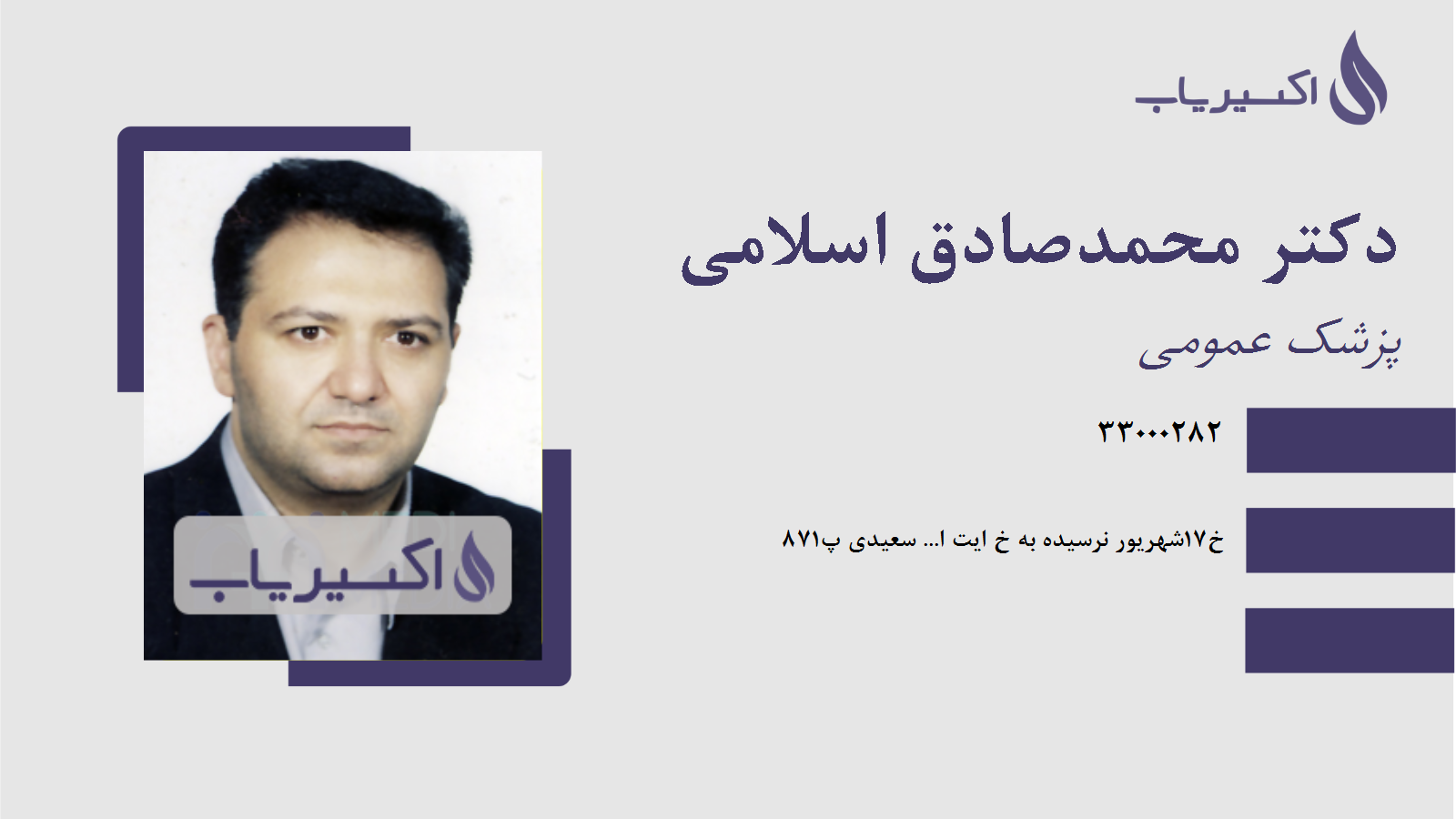 توضیحات توضیحات آدرس آدرس خ17شهریور نرسیده به خ ایت ا... سعیدی پ871 شهر / استان شهر / استان تهران شماره تماس شماره تماس شماره تلفن دکتر محمدصادق اسلامی تهران : 33000282