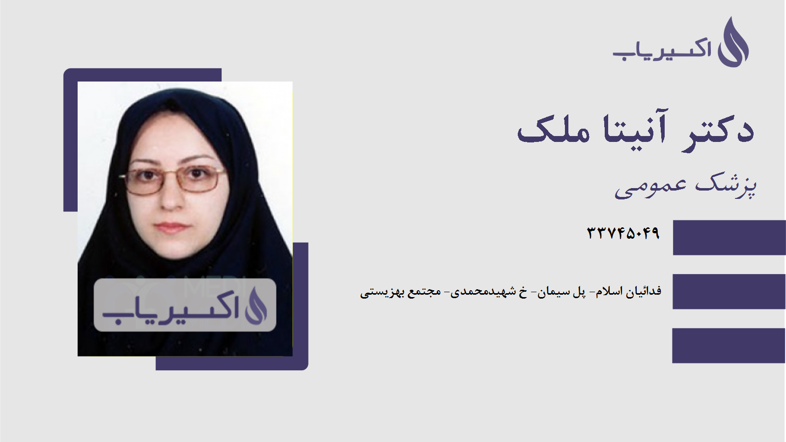 توضیحات توضیحات آدرس آدرس فدائیان اسلام- پل سیمان- خ شهیدمحمدی- مجتمع بهزیستی شهر / استان شهر / استان تهران شماره تماس شماره تماس شماره تلفن دکتر آنیتا ملک تهران : 33745049
