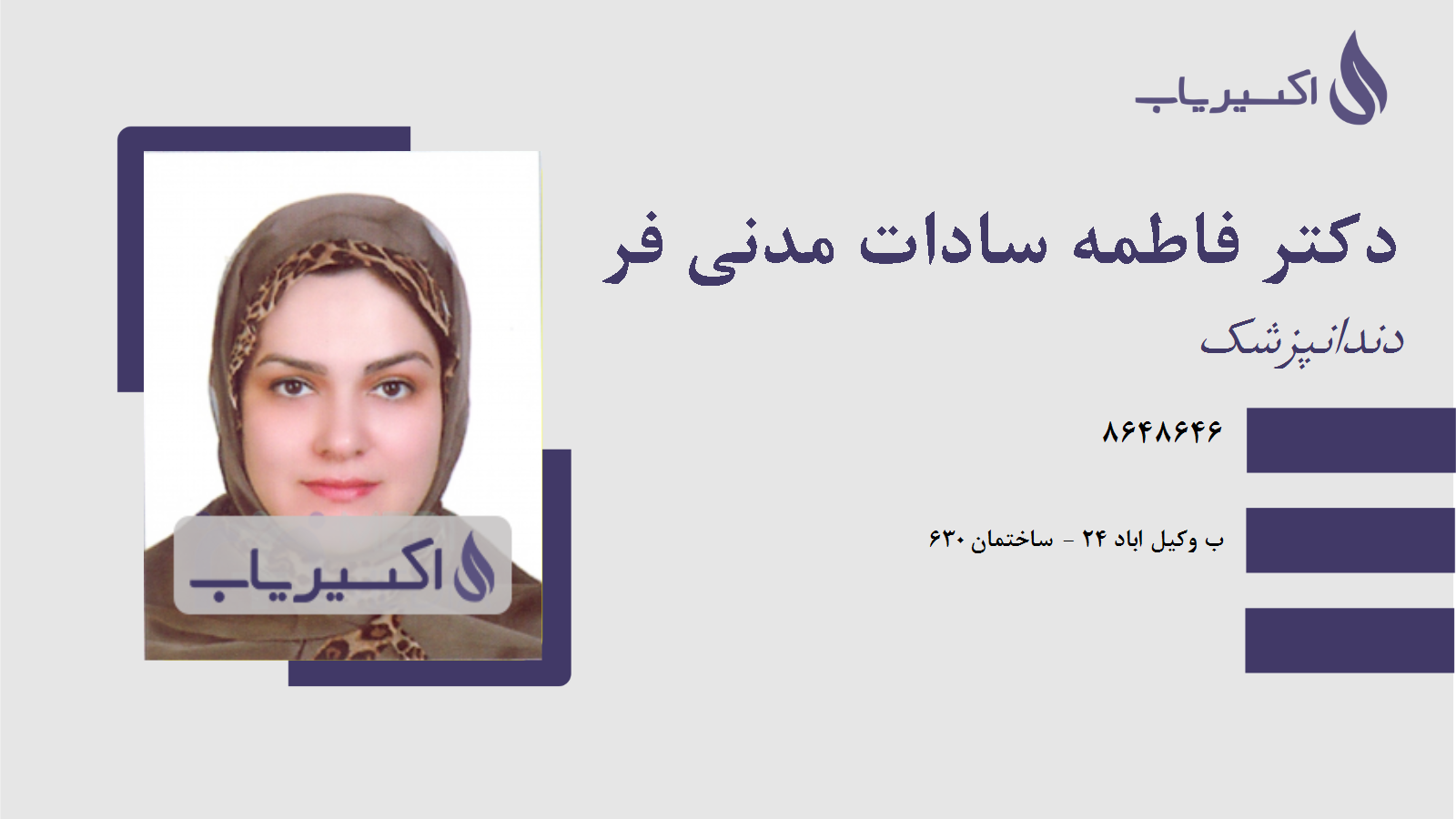 توضیحات توضیحات آدرس آدرس ب وکیل اباد 24 - ساختمان 630 شهر / استان شهر / استان مشهد شماره تماس شماره تماس شماره تلفن دکتر فاطمه سادات مدنی فر مشهد : 8648646