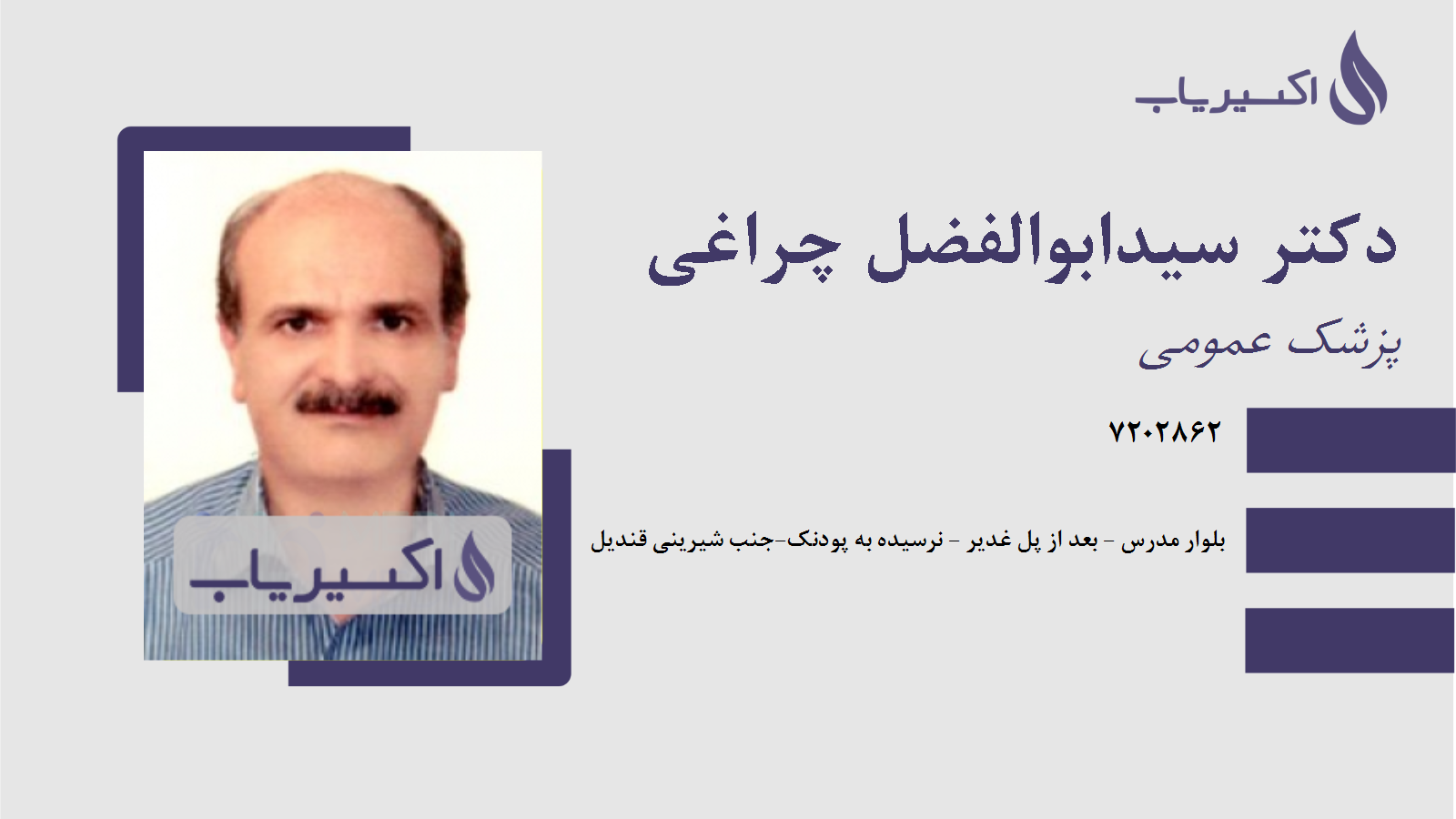 توضیحات توضیحات آدرس آدرس بلوار مدرس - بعد از پل غدیر - نرسیده به پودنک-جنب شیرینی قندیل شهر / استان شهر / استان شیراز شماره تماس شماره تماس شماره تلفن دکتر سیدابوالفضل چراغی شیراز : 7202862