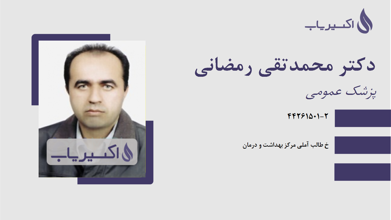 توضیحات توضیحات آدرس آدرس خ طالب آملی مرکز بهداشت و درمان شهر / استان شهر / استان آمل شماره تماس شماره تماس شماره تلفن دکتر محمدتقی رمضانی آمل : 44261501-2